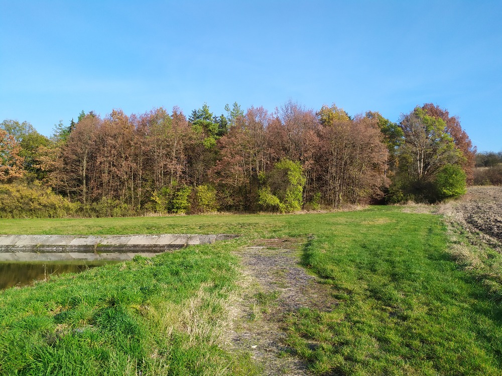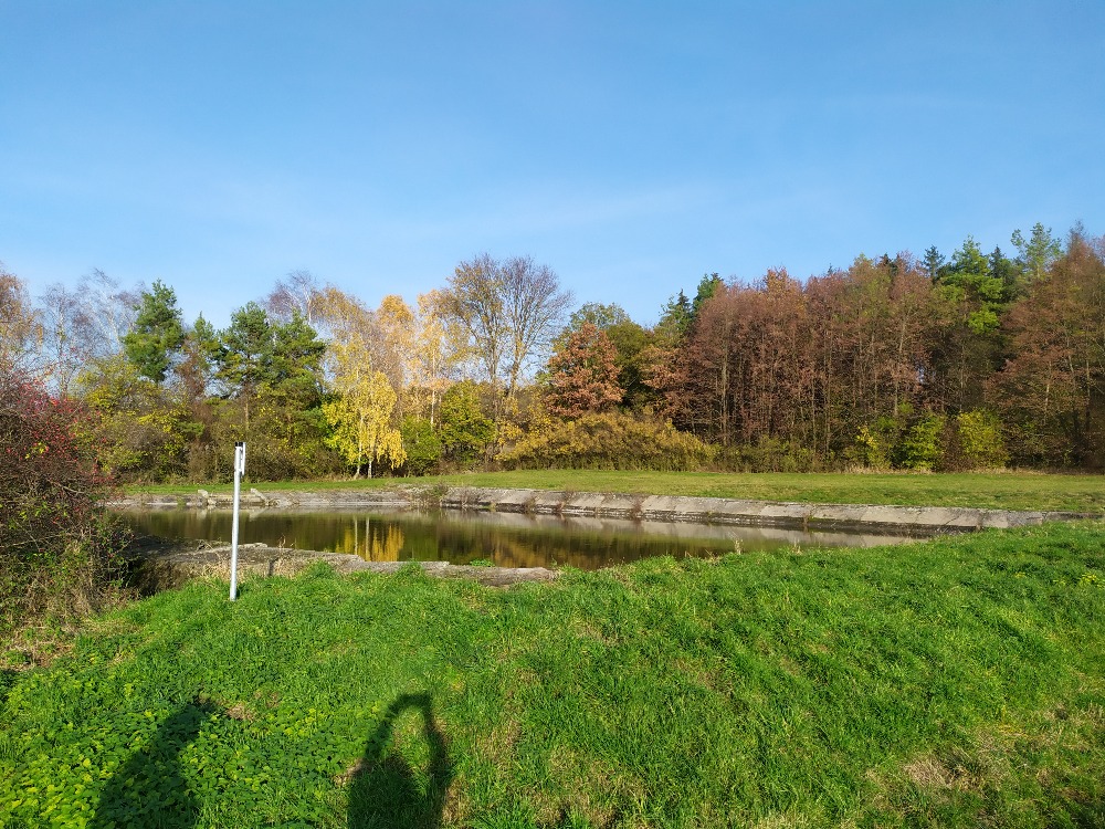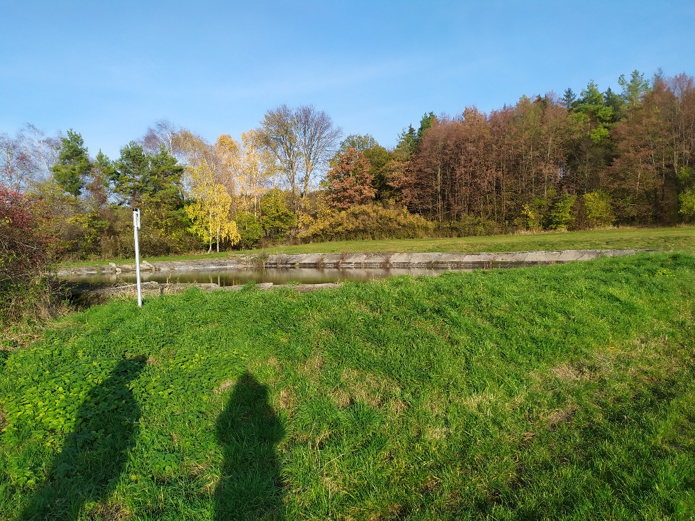 prohlédněte fotografie místa. Travnatá plocha vedle koupaliště má přibližně