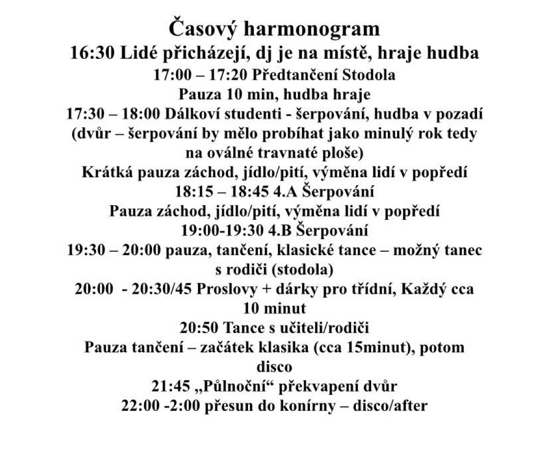 Posilam jen info k plesu, v priloze harmonogram. Je to 27.5. v patek, vice